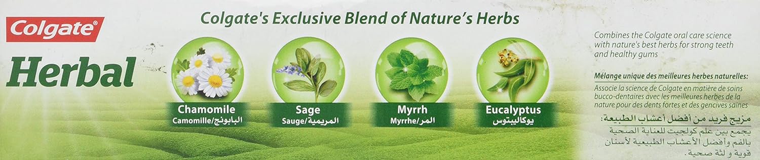 Colgate herbal toothpaste 100g Colgate herbal toothpaste brings to you a unique blend of herbal extracts for healthier teeth and gums. This herbal toothpaste strikes a perfect balance between the science of Colgate and nature’s herbs to bring to you The best of both. This toothpaste contains natural herbs like chamomile, eucalyptus, myrrh and sage which are known for their oral care benefits. Colgate Toothpaste is no. 1 Recommended toothpaste in India. Colgate herbal white toothpaste 100ml combines the science of Colgate with nature’s best herbs – Eucalyptus and mint – and lemon to whiten and strengthen teeth.